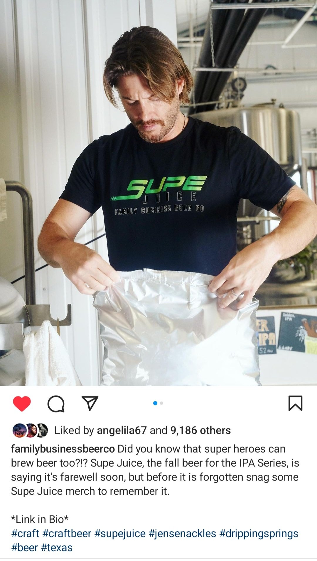 We got a few more summer photos – of Jensen working on the new house (and making Supernatural jokes), soaking up the Austin summer heat, and doing some Family Business Beer outreach for a lucky family at the brewery.